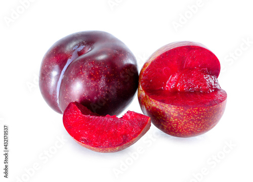 fresh plum fruit and cut plum slices isolated on white background.