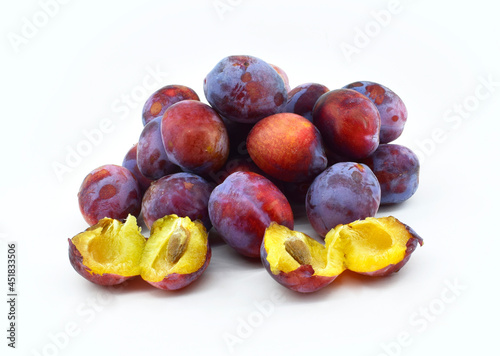 Fresh purple plum and halfs isolated on white background.