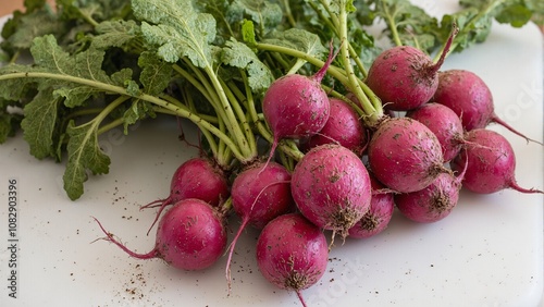 Fresh purple radishes on cutting board some with soil vibrant and ready for cooking