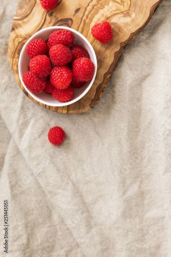 Fresh Raspberries In A Bowl On Linen Background, Top View, Space For Text