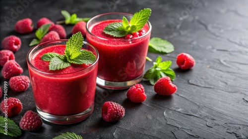 Fresh raspberry smoothies with mint garnish on dark surface, drink, dark, drink,dark, garnish