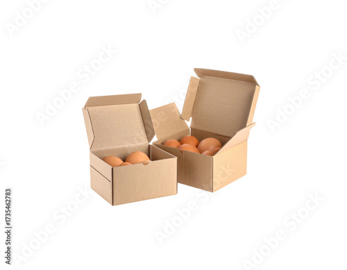 Fresh raw brown and white eggs in open cartons isolated on white background.