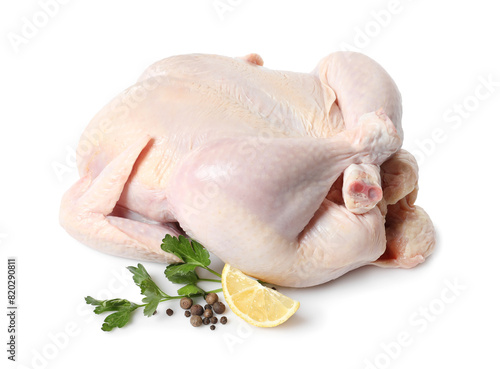 Fresh raw chicken with lemon and spices isolated on white