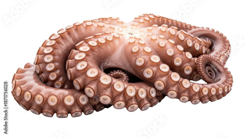 Fresh raw octopus with visible suction cups and curled tentacles, for seafood menu or culinary design isolated PNG with Transparent Background