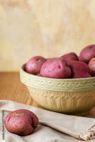 Fresh, Raw, Red Potatoes in a Vintage Bowl on a Wood Table with Yellow Plaster Wall in the Background