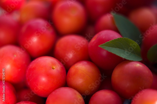 fresh red cherry plums with green leaves