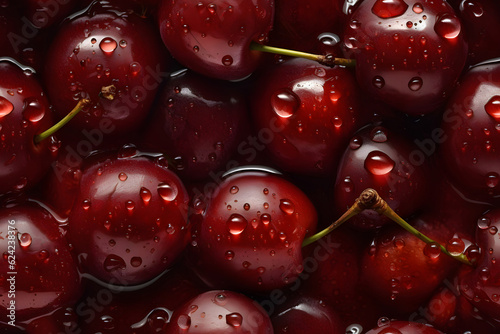 Fresh red cherry with water drops seamless closeup background and texture, neural network generated image
