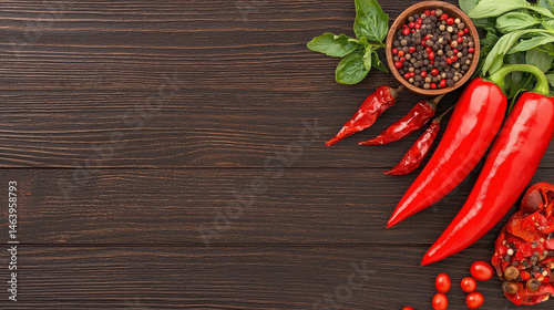Fresh Red Peppers, Mixed Spices, Cherry Tomatoes, and Basil Leaves on Wooden Background