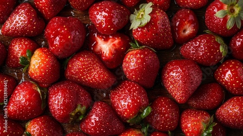 Fresh red strawberries adorned with water droplets sit alongside mint leaves on a dark background