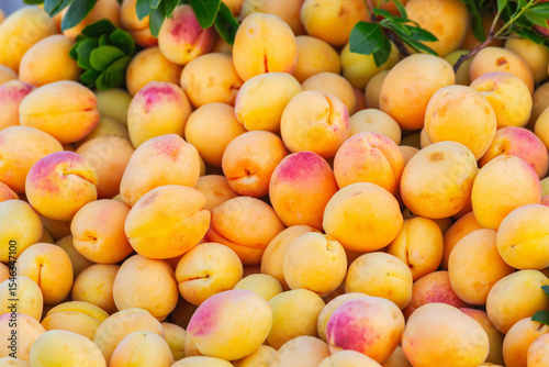 Fresh ripe apricots on display at farmers market, organic seasonal fruit with natural color and texture