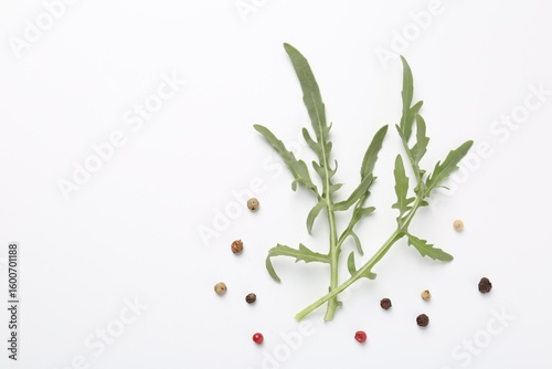 Fresh ripe green arugula leaves and peppercorns on white background, flat lay. Space for text