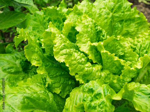 Fresh ripe head of lettuce cabbage (Lactuca sativa) with lots of leaves growing in homemade garden. Close-up. Organic farming, healthy food, BIO viands, back to nature concept.
