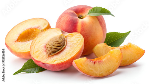 Fresh ripe peaches with green leaves isolated on white background showcasing juicy fruit and natural texture for healthy eating and summer recipes