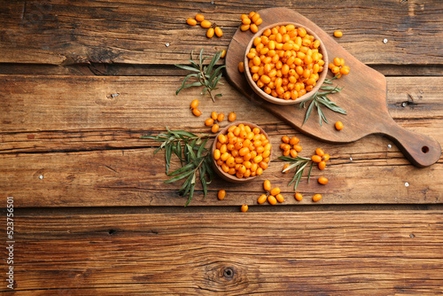 Fresh ripe sea buckthorn on wooden table, flat lay. Space for text