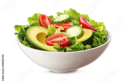 Fresh salad with avocado, tomatoes, and cucumbers in white bowl, showcasing vibrant greens and healthy ingredients. Perfect for nutritious meal or snack