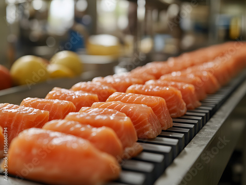 Fresh Salmon Fillets on Conveyor Belt in Modern Fish Processing Facility