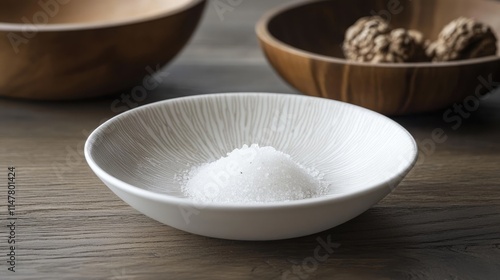 Fresh Salt on White Plate Surrounded by Wooden Bowls and Nuts