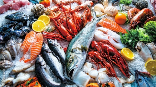 Fresh Seafood Display with Various Fish, Shellfish, and Citrus
