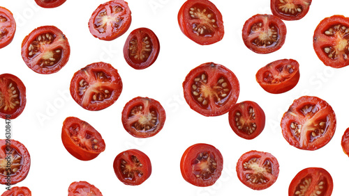 Fresh sliced tomatoes scattered on black background, showcasing vibrant red color and juicy texture. Perfect for culinary presentations and food photography