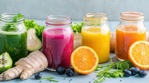 Fresh smoothies in jars with vibrant colors, featuring green, pink, yellow, and orange blends. Surrounded by fruits and vegetables, this healthy display promotes wellness and vitality