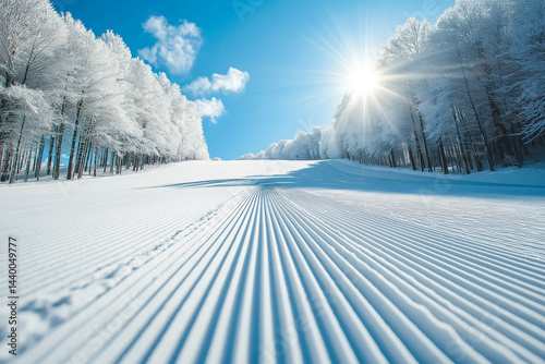 Fresh snow on ski slope during sunny day.