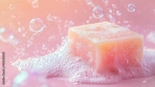 Fresh Square Soap Bar Surrounded by Bubbles on Soft Pastel Background