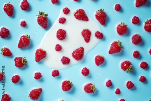 Fresh strawberries and raspberries arranged creatively on a vibrant blue background