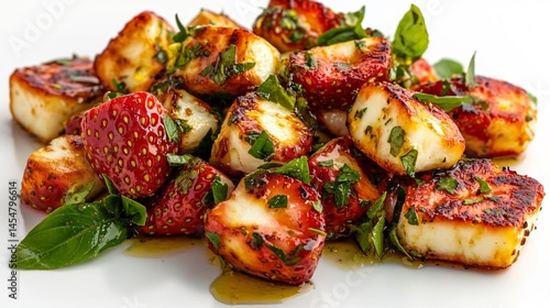 Fresh strawberry and halloumi salad with lemon zest, olive oil drizzle, isolated on a clean surface