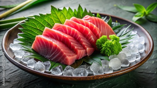 Fresh Tuna Sashimi: Icy Plate with Green Garnish - Premium Stock Photo