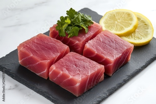 Fresh Tuna Slices with Cilantro and Lemon on Black Slate Plate