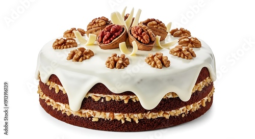 Fresh Walnut Cake with Smooth Icing Isolated on White Background