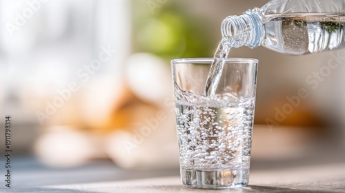 Fresh water being poured into a glass, highlighting hydration and refreshment in a bright, inviting setting.