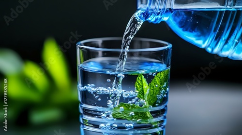 Fresh water pouring into glass with mint leaves creating dynamic splash, blue liquid stream against dark background with green accents and bokeh effect.