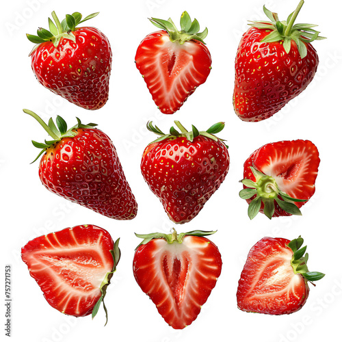 Fresh whole and sliced strawberries isolated on transparent background PNG. Studio photography with close-up detail. Healthy eating and summer fruits concept. Design for menu, recipe book, food blog