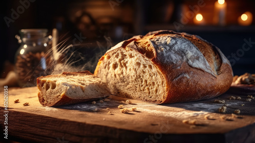 Freshly baked bread on wooden table. Generative AI