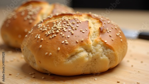Freshly baked bread roll with sesame seeds on cutting board