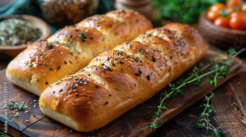 Freshly baked bread with herbs and spices on a wooden board