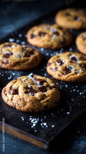 Freshly baked chocolate chip cookies with sea salt on dark baking tray