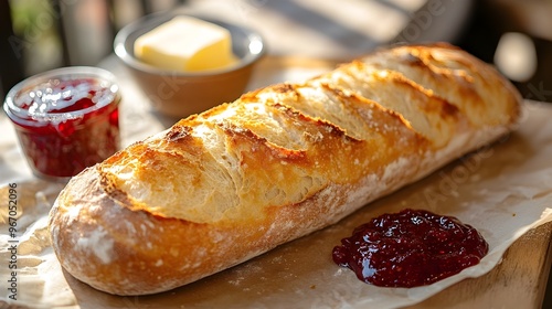 Freshly Baked French Baguette with Butter and Jam in Warm Sunlight
