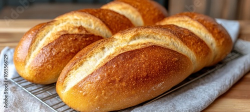 Freshly baked homemade bread loaves on a wire cooling rack. Golden brown crusty bread,