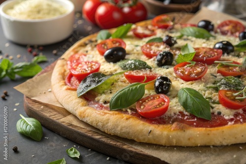 Freshly Baked Margherita Pizza Topped With Basil and Cherry Tomatoes