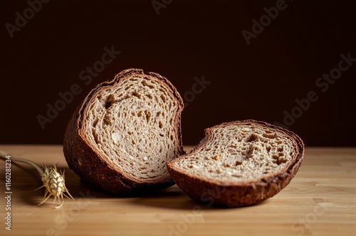 Freshly Baked Whole Grain Bread Loaf Cut in Half with Wheat Grain on Wooden Table