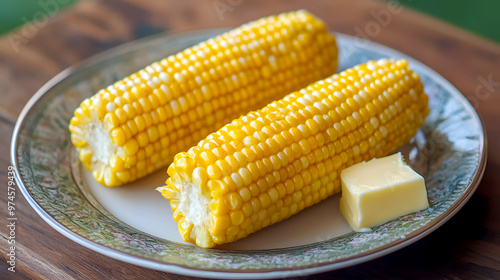 Freshly boiled corn on the cob, with a golden yellow hue and a side of butter for a simple