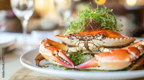 Freshly Cooked Crab with Garnish on Elegant Dining Table