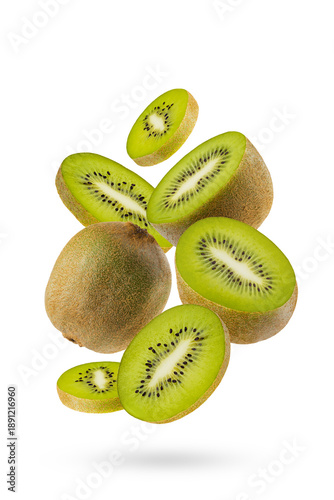 Freshly cut kiwi fruit slices with bright green flesh, tiny black seeds soar as flow, isolated on white background. Great for summer detox menu, vitamin product promotion, design, label, poster.