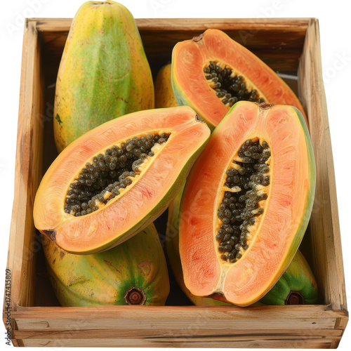 Freshly cut papayas in wooden crate showing vibrant orange flesh and seeds isolated on white background