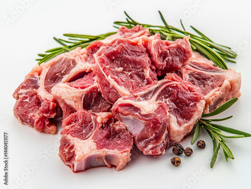 Freshly cut raw meat pieces in vibrant red hues, neatly arranged on a white background, highlighting their marbled texture and culinary potential.