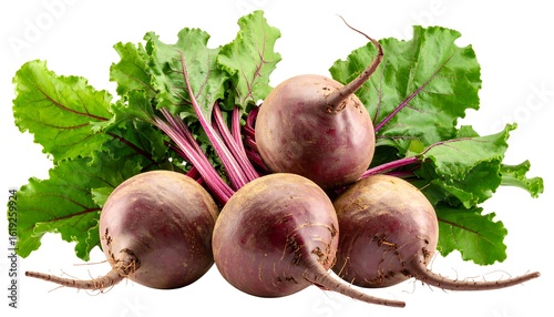 Freshly harvested beetroot arrangement with vibrant green leaves isolated on white