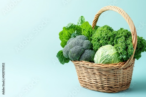 Freshly harvested green vegetables in a woven basket.