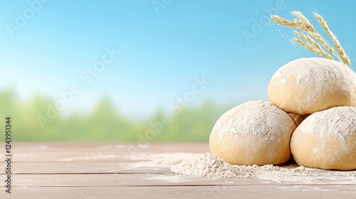 Freshly Prepared Dough Balls on Wooden Surface with Wheat Grain and Blue Sky in Background